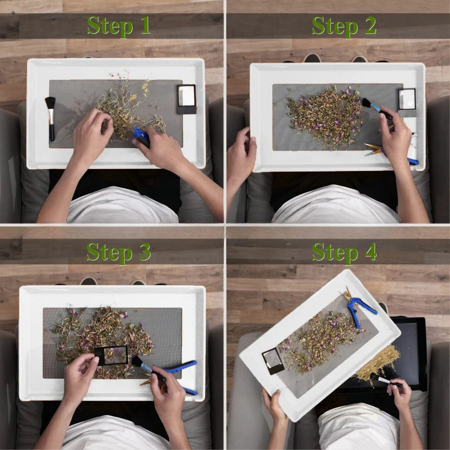 - TRIMMING BUNDLE: Trim your plants with kit including (1) Trimming Tray with 150 micron pollen screen, (1) bottom harvest bin, (2) pairs of scissors, (1) brush, (1) magnifying card